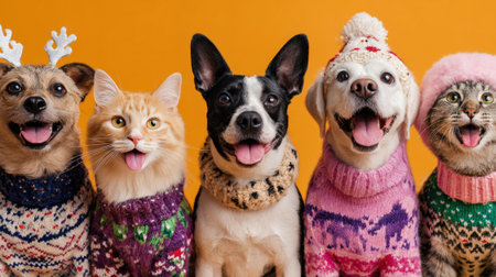 A cheerful group of dogs and cats dressed in vibrant holiday costumes, captured in bright studio lighting. The image showcases a joyful and festive pet fashion theme.