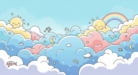 Moon showing whimsical cartoon sky filled with smiling suns, fluffy clouds, moon, stars, and a rainbow. resolution