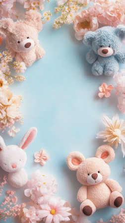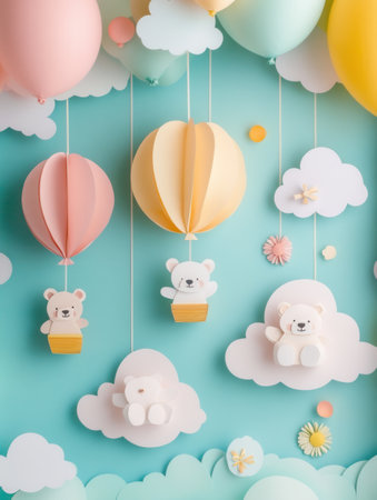 Colorful balloons and adorable teddy bears float among fluffy clouds, offering a fun and magical vibe perfect for childrens events or decor.