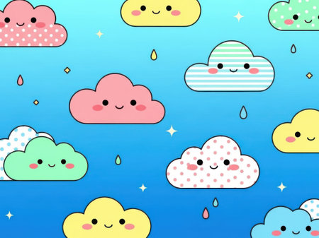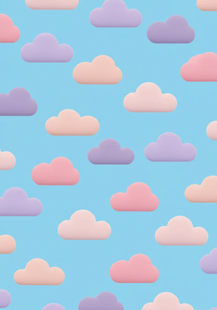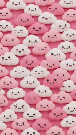 A delightful arrangement of cartoonish clouds with different facial expressions set against a vibrant pink backdrop.