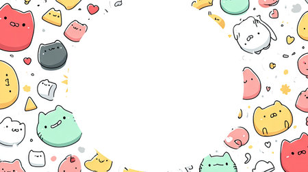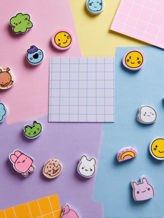 Colorful kawaii stickers are neatly placed on a pastel grid with space left open for additional designs or notes in a playful artistic setup.