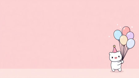Chibi character with a party hat holds several balloons and poses happily against a soft pink background for a fun celebration