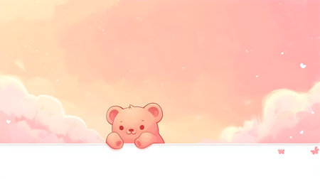 A charming and whimsical image of a soft plush pink bear nestled among fluffy pastel clouds against a warm sunny sky The stuffed animal appears cuddly and comforting evoking a sense of childhood
