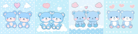 Two sleepy baby blue bears sit side by side against sky-blue polka-dot and cloud-dotted backdrops, framed by pink hearts for a tender, dreamy nursery aesthetic full of warmth and comfort.
