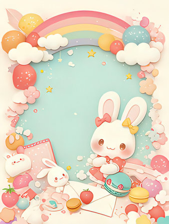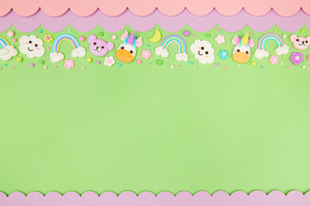 pastel green kawaii flyer background with cute cartoon animals, unicorns, decor