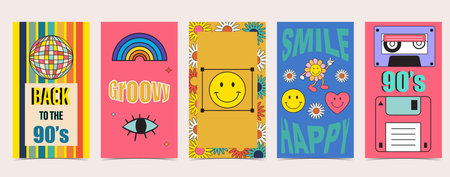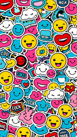 A trendy Y2K aesthetic collage featuring cute smile patches and stickers in a comic pop art style, perfect for digital design and graphic projects.