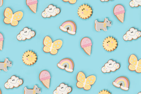Summer wallpaper, texture made with funny cookie gingerbread on blue background. Top view Flat lay.