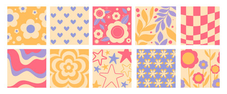 Retro groovy pattern with daisy flowers, hearts and stars - y2k seamless backgrounds. Floral geometric designs, wavy stripes, checkerboard motifs by nostalgic aesthetic. Vibrant decorative set.