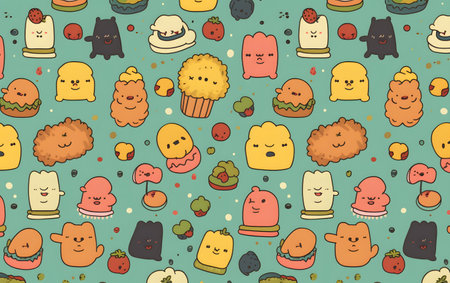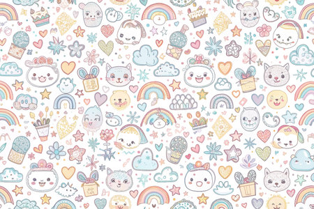 Cute pastel animal faces, clouds, rainbows, and plants seamless pattern