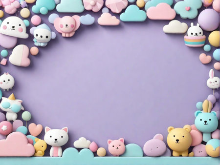 Abstract purple pastel background with kids accessories from clay, Concept of pop art culture, 80s, 90s, creative design, nen plastic bold color experimental idea