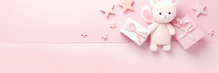 Cute pink baby newborn set of toys, baby wear and gifts. Childrens concept banner with copy space for text
