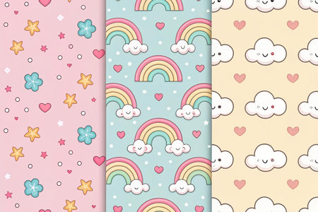 Cute pastel rainbow, cloud, star patterns; seamless kids textile