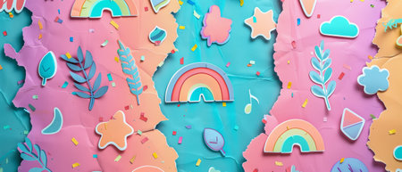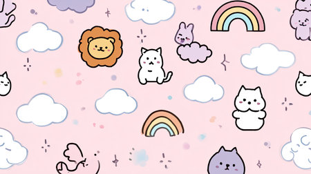This delightful pattern features cute cartoon animals, fluffy clouds, and vibrant rainbows on a soft pink background, perfect for playful designs.