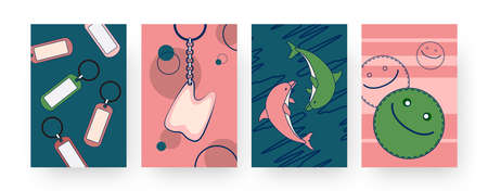 Set of contemporary art posters with bright funny trinkets. Vector illustration. .Bibelots for keys with dolphin, tooth symbols and pendant in colorful design. Bibelot, accessory, souvenir concept