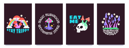 Psychedelic groovy mushrooms weird neon prints for t-shirts. Magic mushroom, skull, flower and rainbow. Trippy 70s poster design vector set