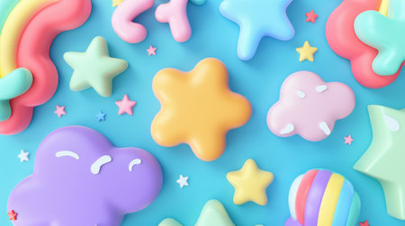 Abstract 3D render of color abstract shape. Kid doodle graphic element. Cute cloud, flower shape, star, wave, rainbow, doodle in trendy modern style. Modern cartoon illustration..