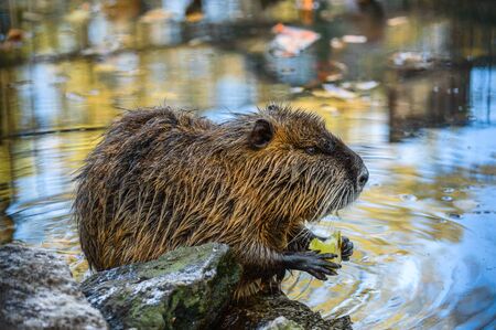 Coypu eating an Apple beside a Lake with golden Autumn Colours in Germany Duesseldorf invasive