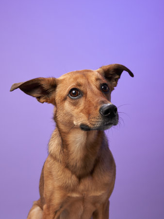 Portrait of a beautiful dog lilac background. Mix of breeds. Happy Pet in the studio