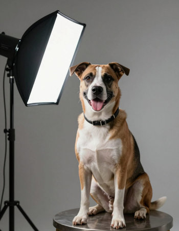Studio shot of an adorable mixed breed dog sitting in front of a studio light