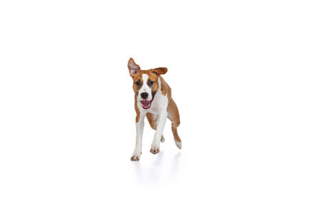 Portrait of cute dog of Cavalier King Charles Spaniel isolated over white studio background. Funny doggy. Concept of motion, beauty, vet, breed, pets, animal life. Copy space for ad