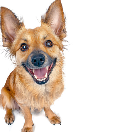 This image features an adorable small dog with a fluffy coat and bright eyes, radiating joy and playfulness against a clean white background.