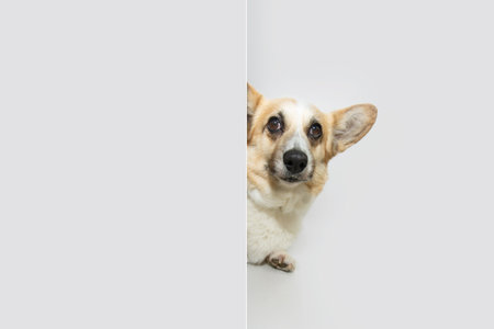 Cute Corgi puppy dog peeking from behind white or gray wall, curious and begging expression