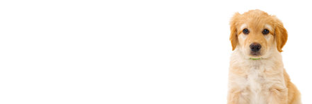 Cute Golden puppy on white background. Hovawars breed. cute young puppy. purebred puppies. Funny head shot of cute golden puppy. Looking curious towards camera. banner