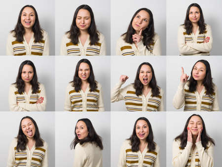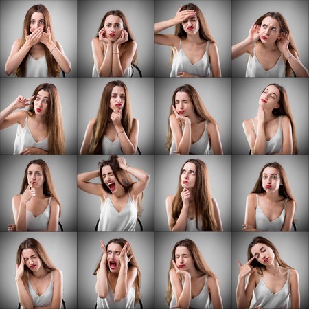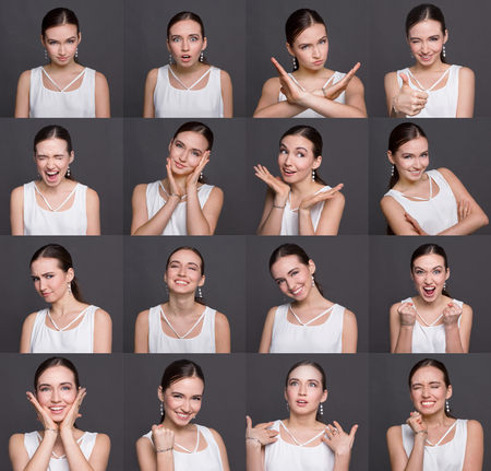 Actor Emotion Card. Collage of Young adult woman with various expressions neutral, positive and negative emotions.