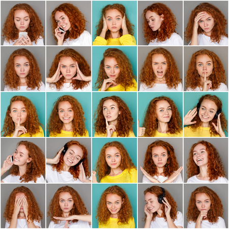 Collage made of photos of beautiful females half-length portraits isolated on green studio background. Young emotional redhair girl. Facial expression, human emotions. Smiling, hopeful, pointing