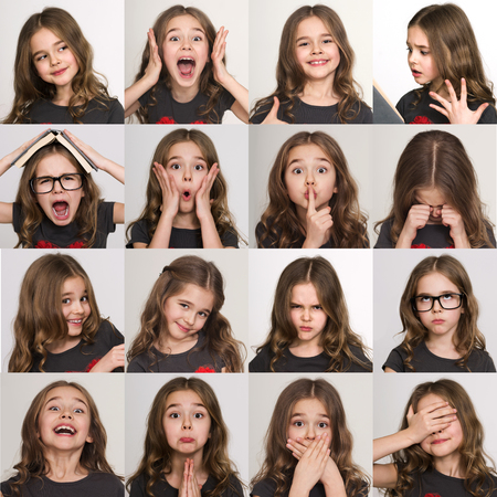 Multiple portraits of the same little girl making diferent expressions