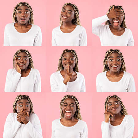Different Emotions Collage. Composite mosaic set of african american female emotional portraits. Young black woman grimacing and reacting on camera at pink studio background, image montage