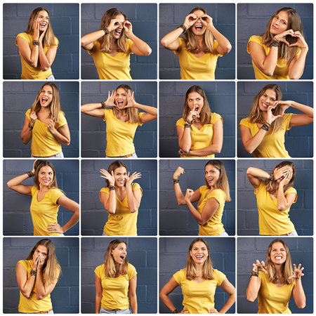 Shes got a face for any occasion. Composite image of an attractive young woman doing various poses in the studio.