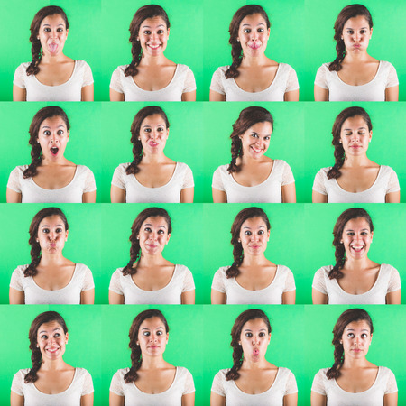 Beautiful woman multiple portraits on green background. Each image is showing a different emotion like happiness, sadness, fear and some more.