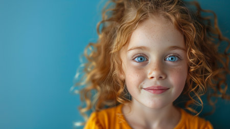 Portrait of a little girl with curly hair on a blue background