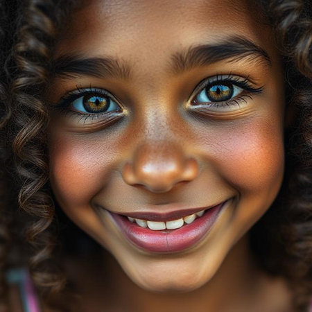 A close-up portrait of a young girl with long, dark hair and freckles. She is wearing a colorful shirt and has a warm, inviting expression on her face. She is looking off-camera with a subtle smile. The background is blurred and out of focus, giving the image a soft and dreamy quality.
