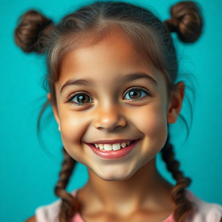 Portrait of a smiling little girl on a turquoise background