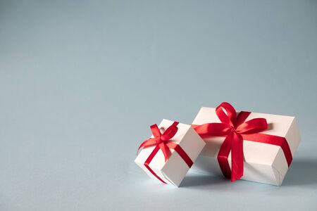 Valentine's Day celebration concept. A nice gift for your loved one. Boxes with bows on delicate blue and pink backgrounds. Copy space. Flat lay. Close-up.