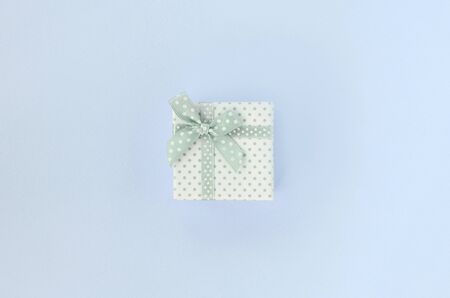 Gift present box and paper confetti on a blue table background from above. Flat composition. Greeting card for birthday, mothers day or wedding.