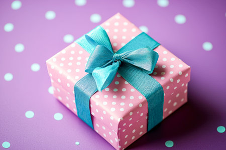 A charming pastel pink box adorned with white polka dots, topped with a vivid blue ribbon bow, surrounded by colorful confetti on a vibrant purple bac