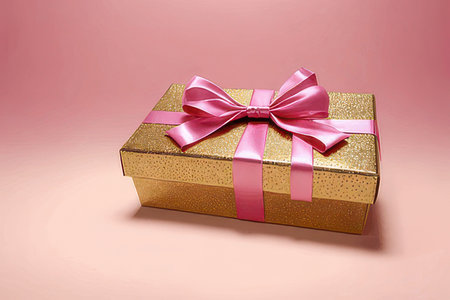 Golden gift box with pink ribbon bow on pink background. 3D rendering