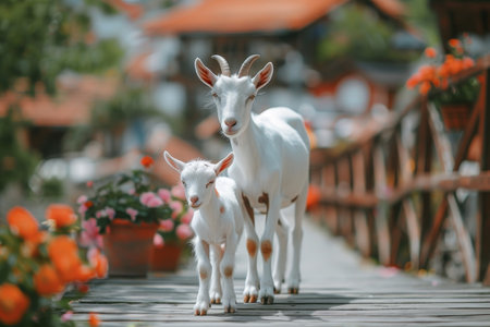 Tender moment as a white goat gently nuzzles its adorable newborn kid in a charming barnyard setting