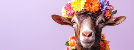 Goat wearing a vibrant flower crown and lei, centered closeup, pastel purple background