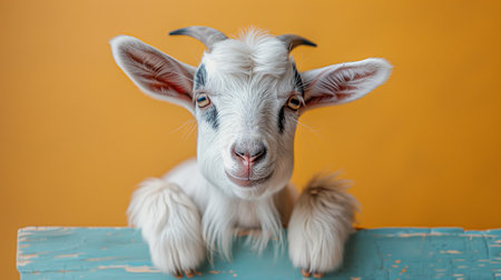 White Goat Peeking Over Blue Plank Against Yellow Wall