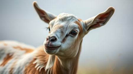 Close up portrait of an expressive baby goat with innocent eyes against a white background by generative AI