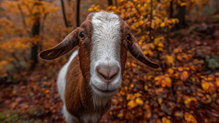 A close-up of a curious goat gazing directly at the camera in a serene autumn forest, showcasing vibrant orange and yellow leaves in the background.