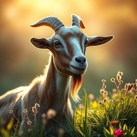 charming goat wearing a patterned vest, adorned with a bell necklace, in a pastoral style, vibrant meadow colors, detailed textures, natural pose composition, high resolution
