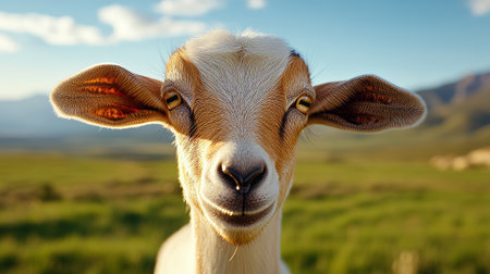 Portrait of a happy funny looking goat staring at camera and smiling, great details.