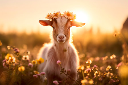 Adorable baby goat with crown of flowers under sunset golden hour in rural field