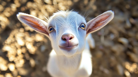 This captivating close-up image features a curious goat with a playful expression, showcasing its adorable features and personality against a rustic background.
