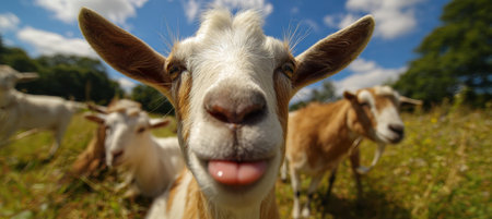 A playful goat photobombs a family picnic with its tongue out in a sunny countryside field, creating a spontaneous and comedic scene. Perfect for adding humor to any collection.